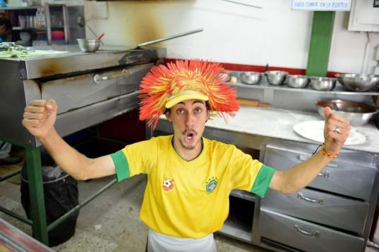 A worker at a pizza store celebrates in San Jose after Costa Rica defeated Uruguay in the FIFA World Cup Brazil Group D match on June 14, 2014. (EZEQUIEL BECERRA/AFP/Getty Images)