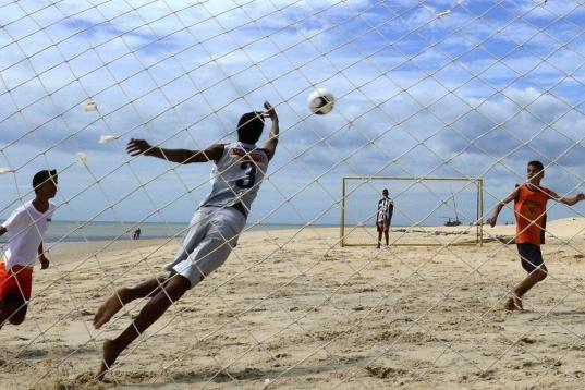 Jóvenes brasileños juegan al fútbol en la playa (Photo credit should read DANIEL GARCIA/AFP/Getty Images)
