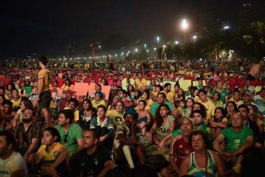 People watch on a huge screen the Brazil vs Croatia opening match during the FIFA Fan Fest in Copacabana Beach in Rio de Janeiro, Brazil on June 12, 2014. Brazil's ambivalence toward the World Cup was on full display as the country geared up for...