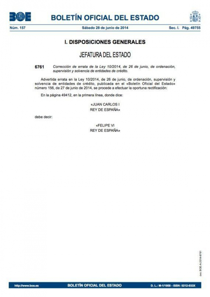 El error fue corregido este sábado mediante otra publicación en el BOE en la que se daba cuenta de la errata y se subrayaba que donde dice "Juan Carlos I Rey de España" debe decir "Felipe VI rey de España".