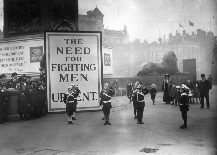 Niños vestidos de soldados con gorros de papel y bastones con armas en posición de firmes observados por una pequeña multitud. Detrás, un aviso que reza "Urgente necesidad de hombres para luchar". Trafalgar Square, Londres, Noviembre de 1914. Imagen: Peter Macdiarmid / Getty Images