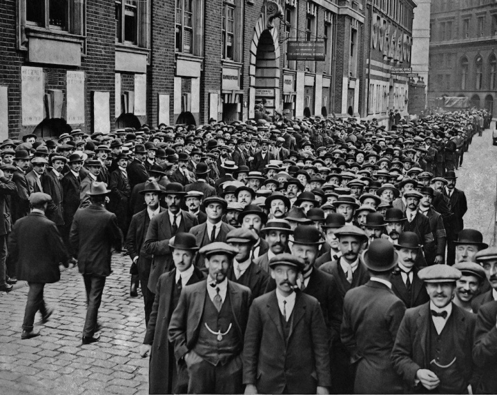 Decenas de hombres acuden a la llamada de la Oficina de la Guerra para hombres casados de entre 36 y 40 años para convertirse en trabajadores de municiones. Scotland Yard, fecha desconocida. Imagen: Peter Macdiarmid / Getty Images