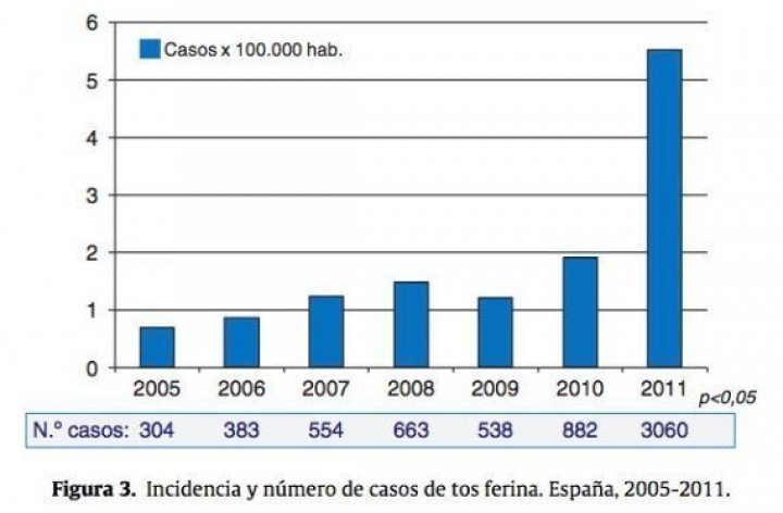 Hasta ahora, la tos ferina no había hecho más que disminuir en las últimas décadas en los países desarrollados. Es una enfermedad muy contagiosa que ocasiona una tos violenta que puede derivar en asfixia, vómitos y pérdidas de conocimiento. Los antibióticos hacen desaparecer los síntomas y reducen el periodo de contagio. Afecta a todas las edades pero es especialmente grave para los bebés, a los que puede causar discapacidad permanente e incluso la muerte.