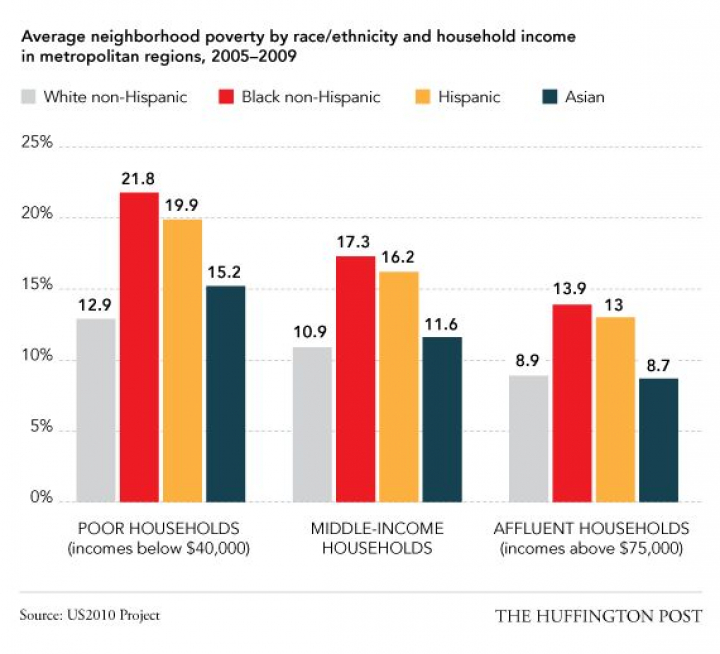 Un análisis de datos del censo de investigadores de la Universidad de Brown demuestra que los ingresos no son el factor principal de la segregación en ciudades de EEUU: "Con solo una excepción (asiáticos de rentas elevadas), las minorías con distintos niveles de renta viven en barrios más pobres que los blancos con ingresos similares".