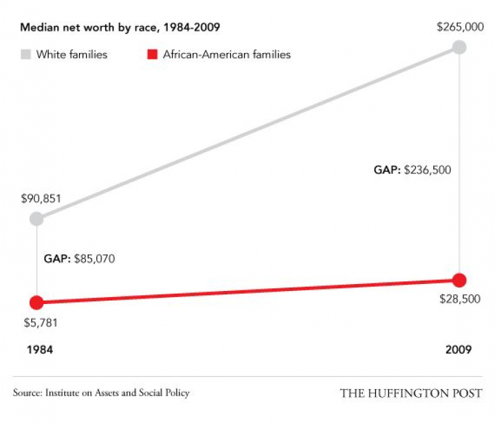 Los estadounidenses blancos concentraron el 88% de la riqueza del país en 2010, según un análisis de datos de la Reserva Federal realizada por Demos, a pesar de que este grupo de población representa el 64% de EEUU. Los estadounidenses negros, que son el 13% de la población, tenían ese año el 2,7% de la riqueza.