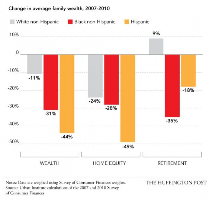 Entre 2007 y 2010, la riqueza de las familias hispanas cayó en un 44% y las de las familias negras en un 31%, mientras la de las blancas se redujo en un 11%.