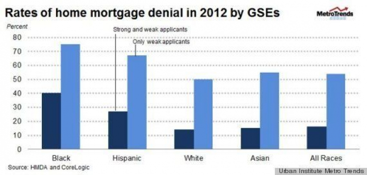 Un análisis de datos del Urban Institute (Instituto Urbano) concluyó que la denegación de hipotecas de servicios dependientes del Gobierno era mayor para los solicitantes negros con expedientes negativos de crédito, que para los blancos.