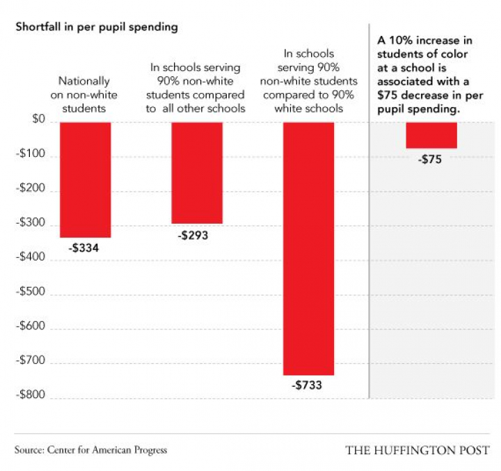 "Un incremento de 10 puntos porcentuales en la cantidad de estudiantes no blancos en un centro educativo está asociado a una reducción de 75 dólares en el gasto educativo por alumno", según un análisis de 2012 del Departamento de Educación del Center for American Progress (Centro para el Progreso Americano).