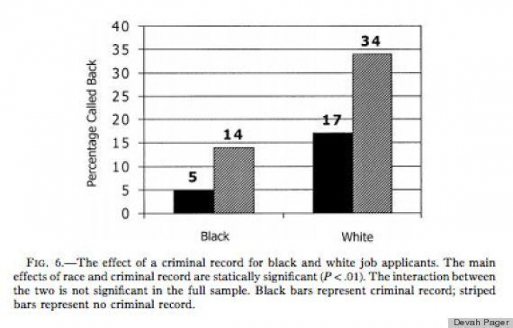 Los jóvenes blancos con antecedentes criminales tienen más posibilidades de que les llamen después de una entrevista de trabajo que los jóvenes negros con las mismas capacidades y sin antecedentes, según un estudio de 2003 del American Journal of Sociology.