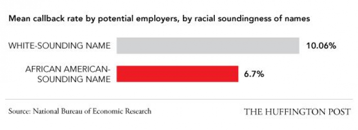 A los demandantes de empleo que tienen nombres más típicos de blancos les llaman una vez por cada 10 curriculum enviados, mientras a los que tienen nombres que suenan a negros les llaman una vez por cada 15 currículums enviados, según un estudio de la Oficina Nacional de Investigación Económica. "Según nuestras estimaciones, un nombre blanco proporciona las mismas posibilidades de que te llamen que 8 años de experiencia laboral", según los investigadores.
