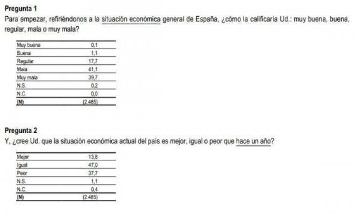 Pero los españoles continúan sin ver la luz al final del túnel, según el Barómetro del Centro de Investigaciones Sociológicas (CIS) correspondiente al mes de junio. Únicamente un 0,1% cree que la situación económica es "muy buena", un porcentaje que sube sólo al 1,1% para calificarla de "buena". En cambio, un 39,7% cree que es "muy mala", un 41,1% que es "mala" y un 17,7% "regular".