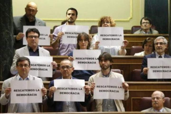 Durante la votación, diputados del grupo de Izquierda Plural han mostrado pancartas en las que se podía leer: "Rescatemos la Democracia", por lo que han sido amonestados hasta en dos ocasiones por el presidente del Congreso, Jesús Posada.