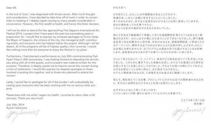 El documento no detalla en qué fase se halla el cáncer que padece Sakamoto ni el tratamiento que recibirá.