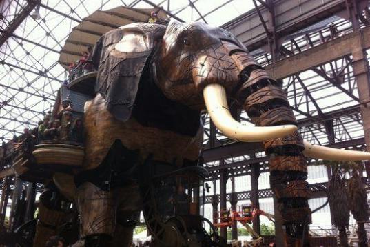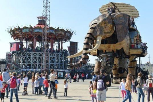 Un elefante barrita y echa agua por la trompa para abrirse paso entre la multitud. Se mueve por toda la Isla de Nantes transportando viajeros por los antiguos astilleros. El billete cuesta 5,50 euros y los menores de cuatro años no pagan, pero ...