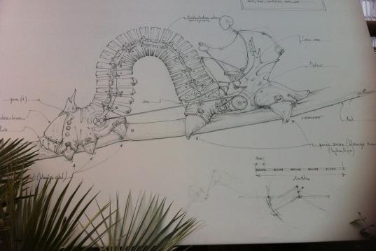 En la Galería de las Máquinas, que discurre paralela a la nave principal del antiguo astillero, se expone el proceso de creación de La Machine, desde bocetos a prototipos o proyectos abandonados.
