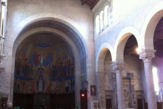 El interior de Notre Dame también intenta imitar el estilo italiano, con el techo de madera y el fresco del altar (que data de los años 30).