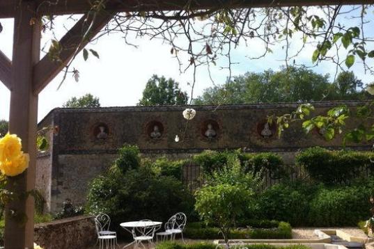 El patio trasero del Château alberga una pérgola, un jardín de rosas salpicado de mesitas y una galería de bustos de hombres ilustres.