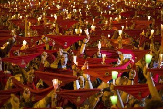 Miles de personas con velas encendidas y ya sin pañuelos se reunieron en la plaza consistorial y calles adyacentes del casco viejo para darle el adiós que se merece a esta cita. Allí estaba su alcalde, Enrique Maya, que lanzó un mensaje de despedida: "Pamploneses, pamplonesas, se han acabado las fiestas de San Fermín. Gracias a vosotros hemos disfrutado unos días inolvidables, de las mejores fiestas del mundo. Ahora toca guardar los pañuelos y esperar a las fiestas de 2015, porque ya falta menos para San Fermín".