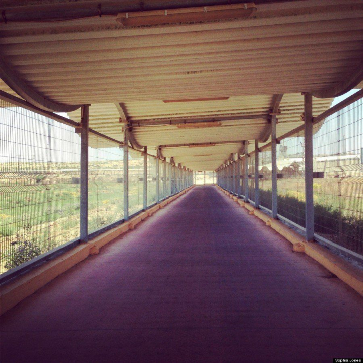 Éste es el paso fronterizo de Erez, entre Israel y Gaza, donde parece que estás abandonando una prisión de máxima seguridad. Es un largo y caluroso paseo en verano. El cruce es utilizado por los periodistas, trabajadores humanitarios y algunos palestinos que consiguen permisos especiales. La mayoría de los israelíes tienen prohibido visitar Gaza.