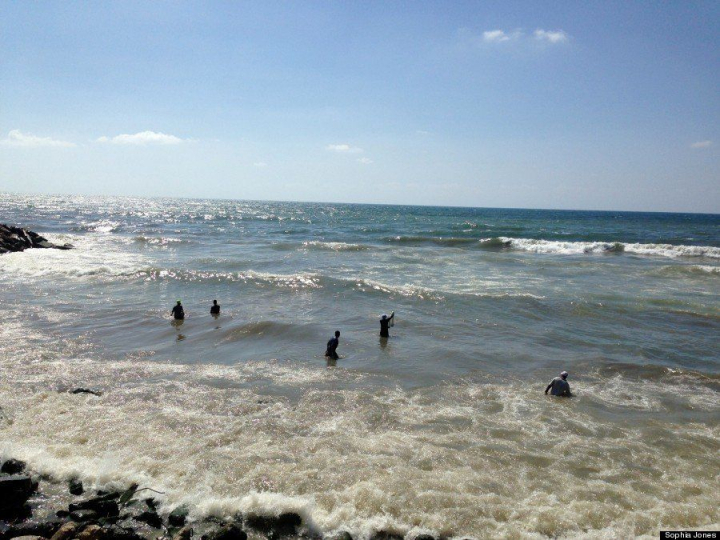 Pescadores palestinos caminan en las aguas poco profundas de la costa en la ciudad de Gaza. Debido al conflicto, no se les permite pescar nada desde sus barcos. Cerca, barcos militares israelíes y combatientes de Hamás disparan a menudo en las dos direcciones, cerca de la costa y de noche. "Apenas puedo encontrar peces para alimentar a mi familia", dice Anwar Qasqeen, que ha sido pescador durante más de 30 años, mientras las olas rompen con fuerza contra las rocas. "No puedo tener una vida. Queremos paz".