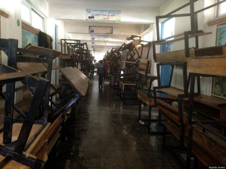 Unos pupitres se apilan en el interior de una escuela de las Naciones Unidas en la ciudad de Gaza, para dar cabida a cientos de familias del norte de la franja, que ahora buscan refugio allí.