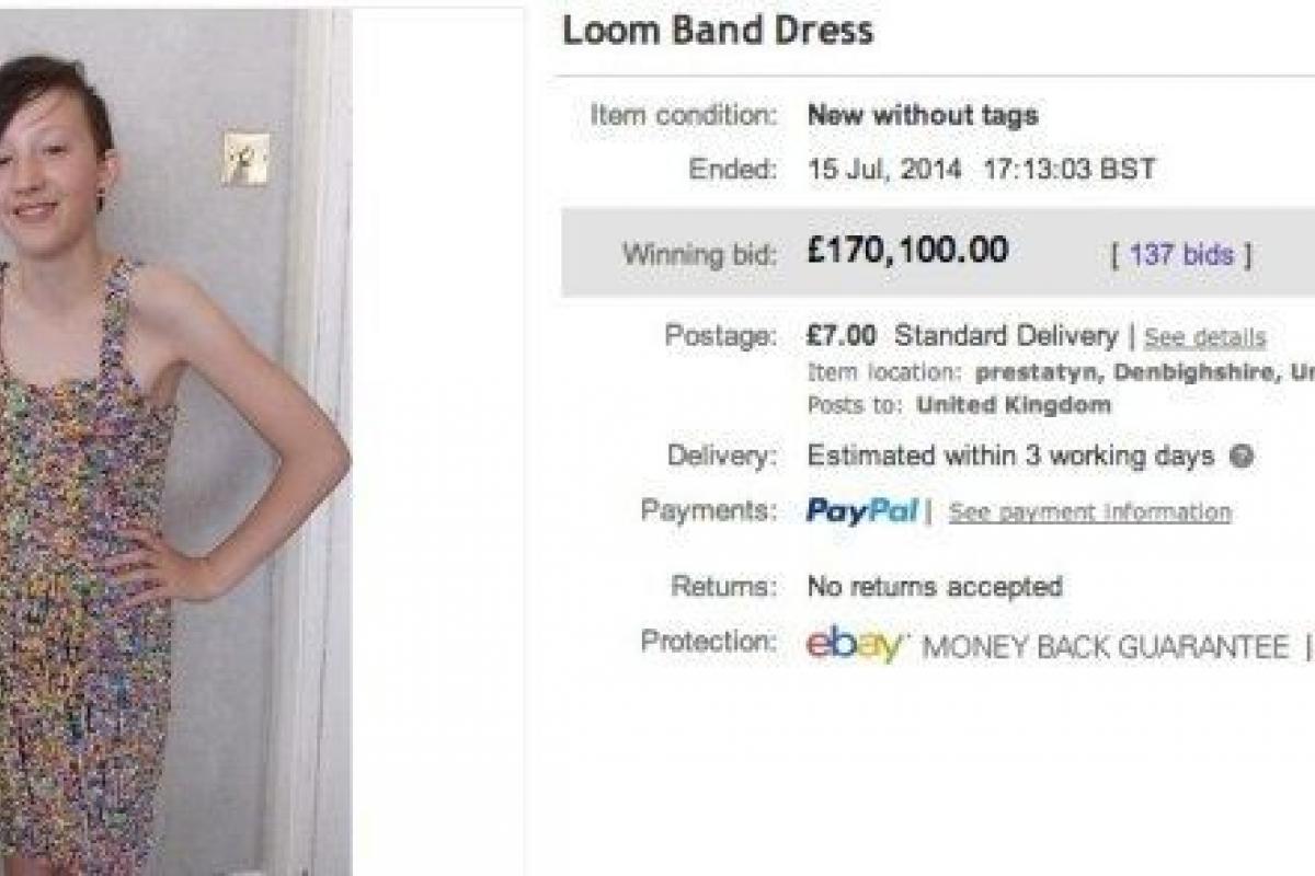 Después de más de 40 horas de trabajo y de haber hecho 20.000 pulseras de goma, el vestido estaba completado y Wright lo puso a la venta en eBay el pasado 8 de julio. Desde The Huffington Post explican que utilizó a su hija Said de modelo y valoró el vestido en 85 dólares (62 euros), de forma que cubriría gastos y ya.