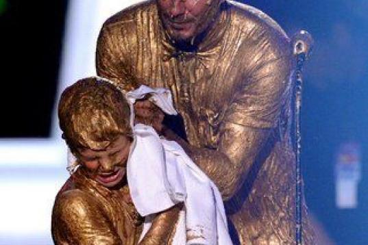 Durante la entrega de los premios Nickelodeon Kids' Choice Sports Awards 2014 en Los Ángeles , en la que los niños que ven esta cadena de televisión escogen a sus deportistas favoritos, el exfutbolista del Manchester United y del Real Madrid subió al estrado a recoger un galardón que le acreditaba como leyenda del deporte. Y lo hizo acompañado de sus hijos Romeo, de 11 años, y Cruz, de nueve. Pero en pleno momento de recogida del premio los organizadores decidieron que un simple trofeo no era suficiente para el chico de oro del fútbol... y acabó bañado, precisamente, en oro.
