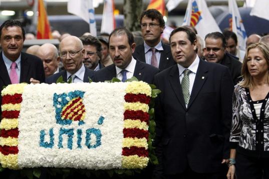 Duran ha comparecido flanqueado por el presidente de la Generalitat, el alcalde de Barcelona y secretario general adjunto de la federación, Xavier Trias, y del que será su sucesor como secretario general de CiU, el conseller de Interior, Ramon Espadaler.