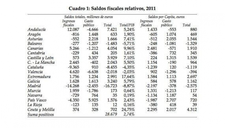 Las balanzas fiscales se han calculado a partir de los gastos y los ingresos. Según De la Fuente, dos tercios de los saldos fiscales se explican "única y exclusivamente" por los ingresos debido a los elevados impuestos de las provincias más ricas, datos que no son "raros ni preocupantes".