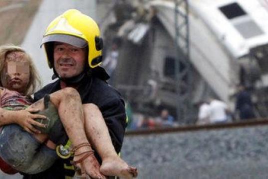 El bombero salvando a una niña, el maquinista hablando por teléfono con la cara ensangrentada junto a un Policía, la labor de los vecinos de Angrois en el rescate, la locomotora destrozada...