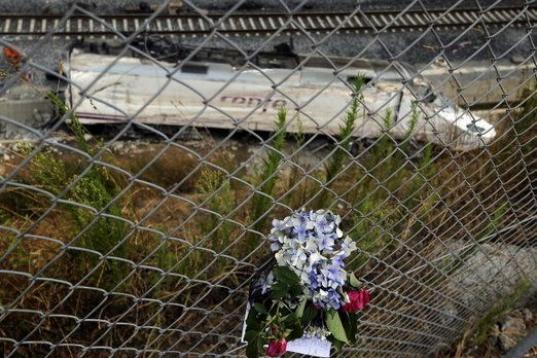 Un ramo de flores recuerda a las víctimas con la destrozada locomotora del tren al fondo