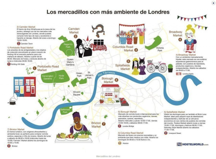 La página web Hosterlworld.com ha hecho una selección de los mercadillos más interesantes de Londres con pistas, cómo llegar y sus horarios. Y lo mejor: también han hecho un divertido mapa para que no te pierdas y sepas ubicar todos ellos.