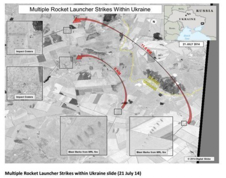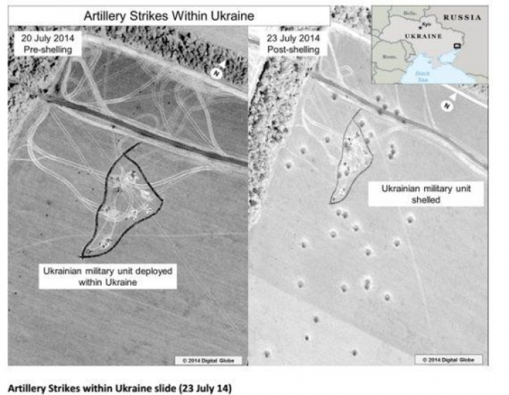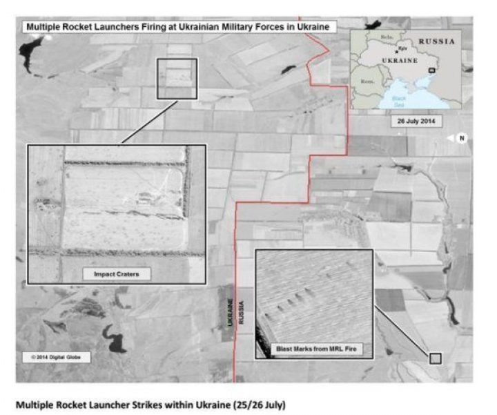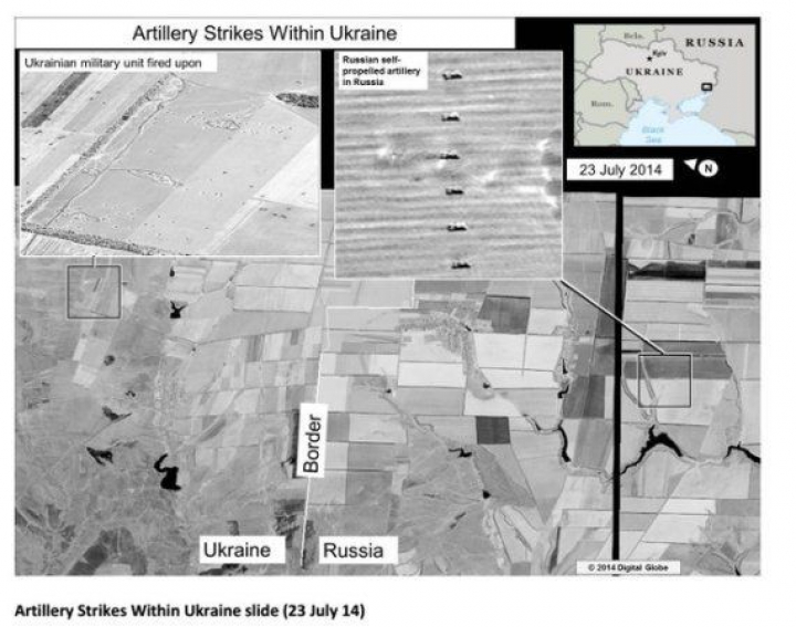Las imágenes, seleccionadas por la Oficina del Director Nacional de Inteligencia, fueron tomadas los días 21 y 26 de julio. El Departamento ya dijo esta semana que tenía evidencias de que Rusia había estado bombardeando posiciones ucranianas desde su territorio para apoyar militarmente a los separatistas prorrusos que están siendo acosados por las tropas fieles a Kiev en la región de Donetsk.