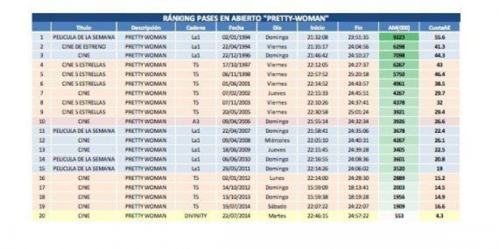 Es una de las conclusiones que recoge la consultora Barlovento Comunicación en su informe del mes de julio. Desde 1994 —cuando se estrenó en abierto en la televisión española— la película protagonizada por Julia Roberts y Richard Gere ha sido emitida un total de 157 veces: 20 pases han sido en televisiones públicas y los otros 137 en televisiones de pago.