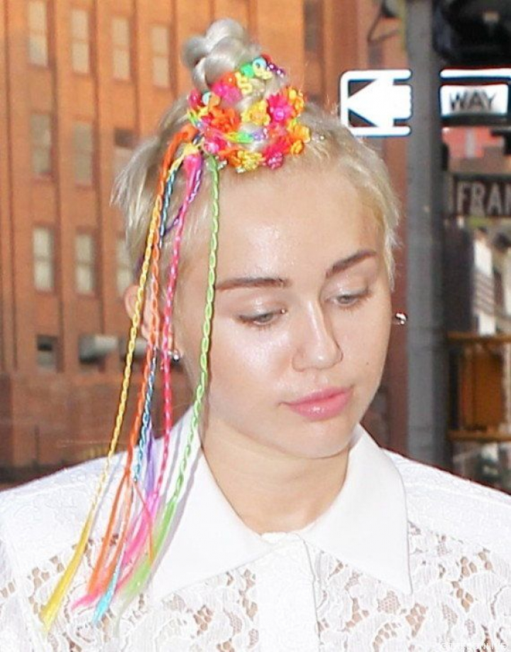 ¿Qué famosa se ha hecho un moño con trencitas, muñecos, letras y gomas de colores? Seguro que sus moños rubios-casi blancos te han dado una pista. Efectivamente, Miley Cyrus ha decidido hacerse este desastre capilar.
