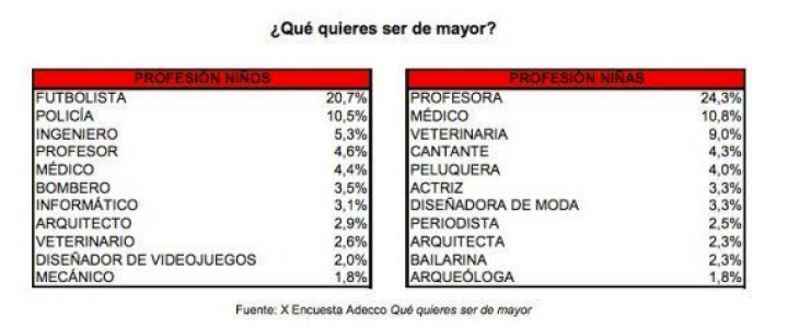 Cuando les preguntan qué quieren ser de mayores, las diferencias entre ambos sexos son claras: en el 25% de los casos, ellos quieren ser futbolistas; ellas, profesoras.