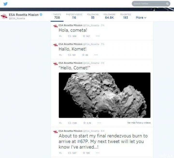 “Hola, Cometa!”. Así ha saludado en Twitter la sonda espacial Rosetta al cometa 67P/Churyumov-Gerasimenko al llegar a su encuentro después de 10 años de largo viaje. El mensaje, escrito en los 23 idiomas que hablan los científicos que participan en la misión, es el inicio de un baile que durará meses y que servirá para conocer todos los detalles de la enorme roca espacial y alumbrar el origen de nuestro planeta.