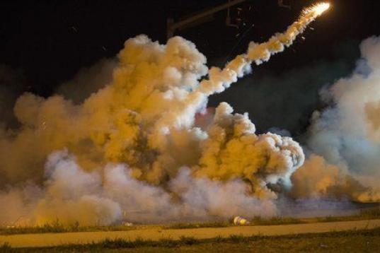 La policía de Ferguson despeja las calles mediante el lanzamiento de bombas de humo.