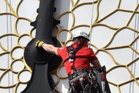 Desde comienzos de semana, cuatro operarios, suspendidos a 95,7 metros de altura y sujetos con cuerdas, se afanan en sacar brillo al reloj a un ritmo de una cara por día.