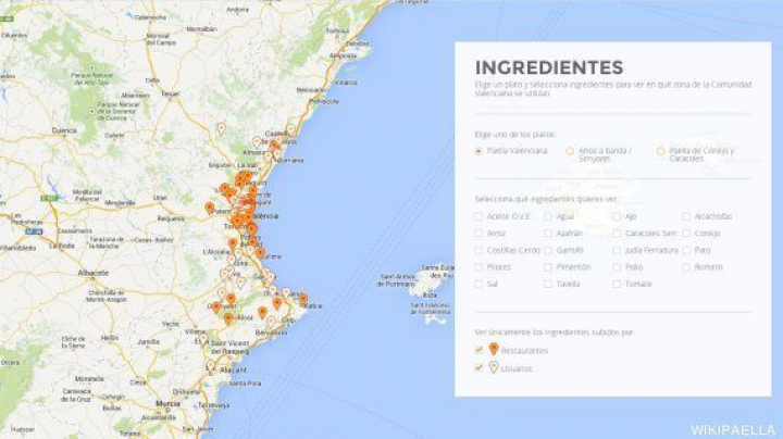 Y efectivamente, eso es Wikipaella. Una vez en la página, entrando en su sección Recetas, hay dos opciones. Por una parte, un mapa sobre el que se puede pinchar en los distintos nombres colocados sobre la Comunidad Valenciana. Cada uno lleva a una persona o un restaurante que explica, ingrediente a ingrediente, su perfecto arroz. Por el otro, una lista donde elegir tanto los platos (paella, arroz a banda/senyoret, paella de conejo y caracoles) como los ingredientes. Desde aceite, agua o ajo hasta pimentón, caracoles, conejo o tomate. Según se seleccione uno de esos platos o de sus ingredientes, se verán las recetas existentes en el mapa.