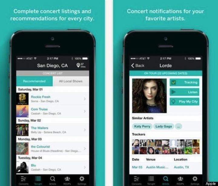 Bandsintown es capaz de sincronizarse con tus archivos de iTunes con tus cuentas en Spotify, Pandora, Rdio y muchas otras aplicaciones y te muestra cuándo son los próximos conciertos de los artistas que te gustan.