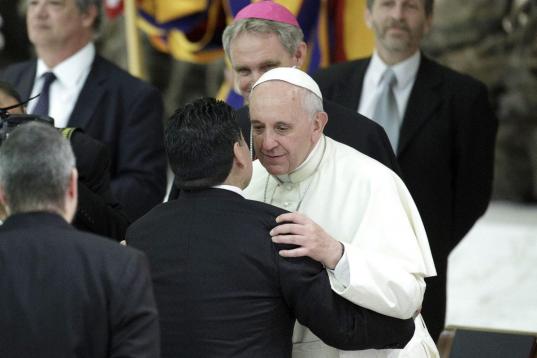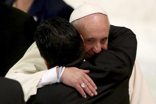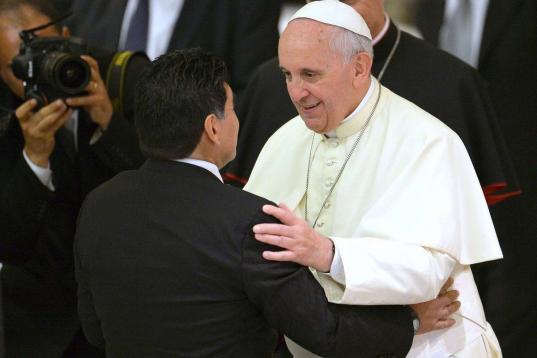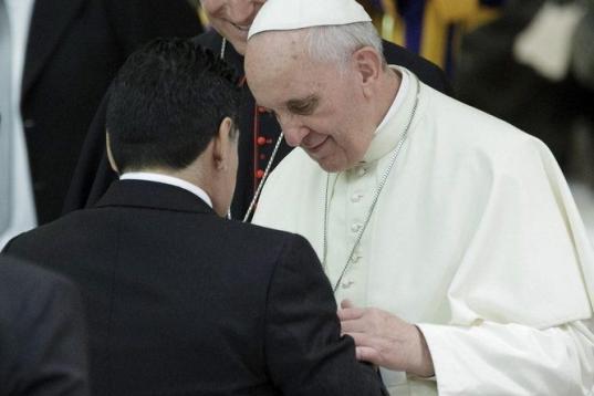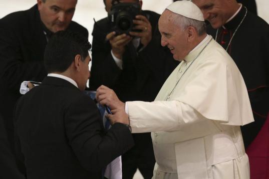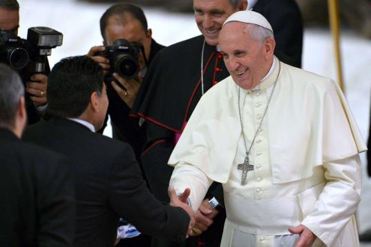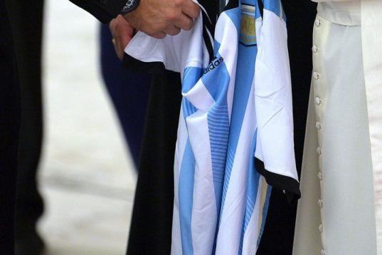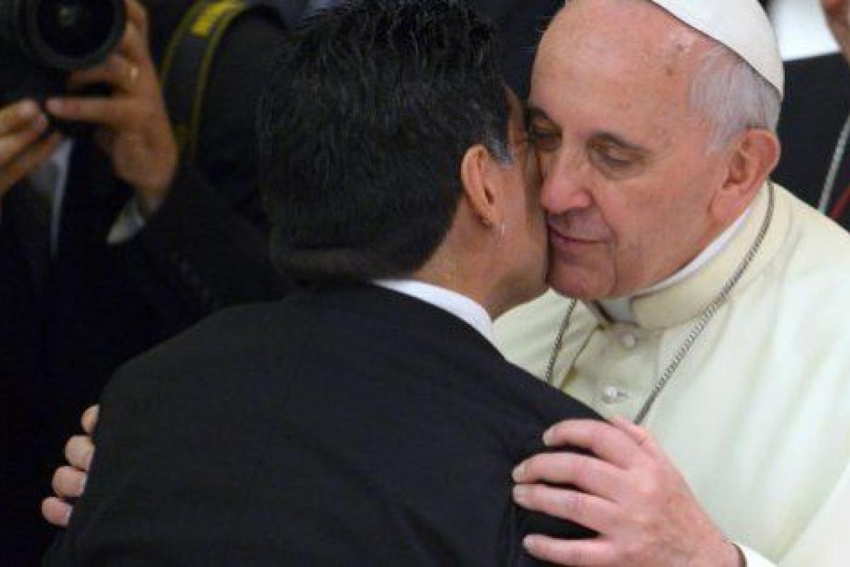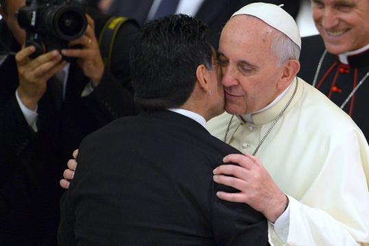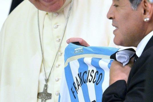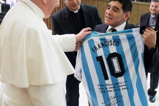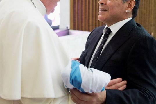 Abrazos y besos entre los dos argentinos más famosos. Diego Armando Maradona ha entregado al papa Francisco este lunes una camiseta de la selección argentina con el número 10 durante el encuentro que ha mantenido el religioso con los protagonistas del Partido por la Paz en el Vaticano.