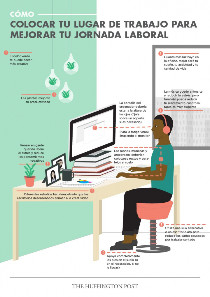 Cómo organizas tu espacio de trabajo —la forma de sentarte, la decoración...— puede influir más de lo que crees en tu productividad y creatividad. Cosas tan sencillas como saber cómo colocar tus pies en el suelo o cuándo tomar un descanso pueden ayudarte a optimizar tu eficacia. Échale un vistazo a esta infografía y descubre cómo debes organizar tu escritorio para triunfar laboralmente. Lista de tareas:
