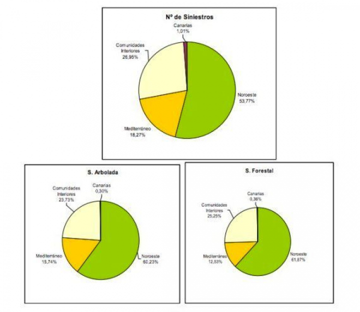 Distribución por zonas del número de siniestros y de la superficie arbolada y forestal arrasada en 2013. Fuente: Magrama