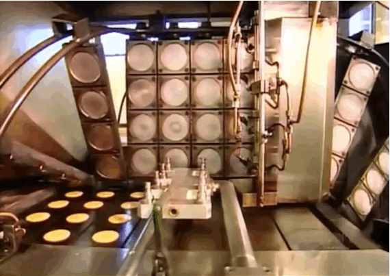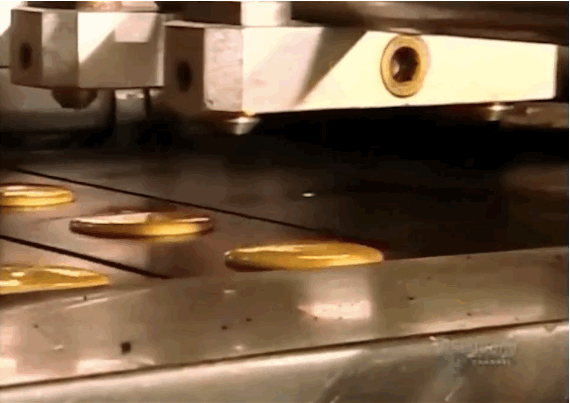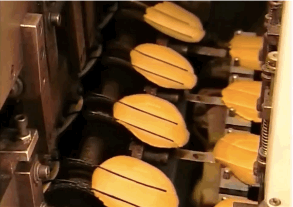 Aquí es donde ocurre la magia. El aparato introduce pequeños papelitos de la fortuna en cada una de las galletas a la vez que les da la forma de doble cono.