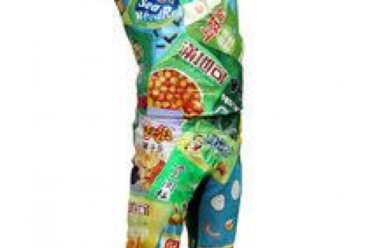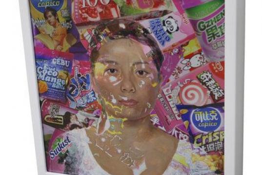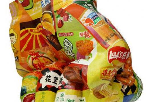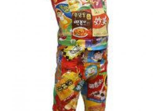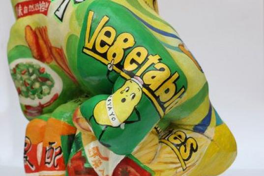En una primera sección de su exposición, Escondido en la ciudad, Liu Bolin se camufla como un camaleón entre revistas y pinturas murales. En la segunda parte, Comida basura, se viste con coloridos envoltorios de aperitivos, latas de refresco y dulces, denunciando el reinado de este tipo de alimentos y la "opresión de su envasado para el consumidor".