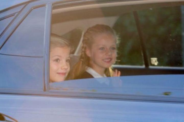 Tanto los Reyes como sus hijas han saludado desde el vehículo, con las ventanillas bajadas, a los numerosos fotógrafos que aguardaban su llegada frente a la entrada del centro, un colegio privado ubicado en la zona residencial de Aravaca y al que van vestidas de uniforme (jersey azul marino y falda gris).
