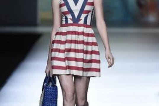 Los vestidos, chaquetas, faldas... de clarísima inspiración marinera del diseñador por dos motivos: 1) la colección se le ocurrió en un crucero y 2) el desfile está patrocinado por Pullmantur. Más claro, el agua (literalmente)
