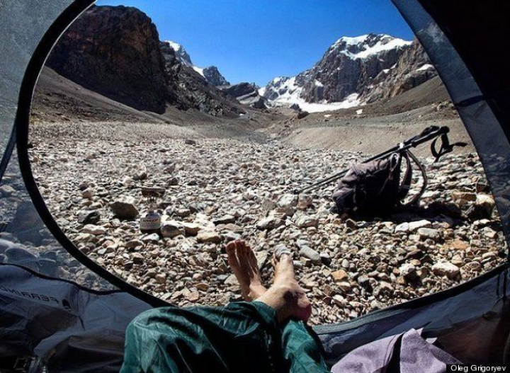 La serie de imágenes incluye una acampada a 4.700 metros sobre el nivel del mar. Y todas fueron tomadas desde el interior de la tienda de campaña de Grigoriev. En ellas se pueden ver sus piernas extendidas y un vibrante paisaje que contrasta con la tela de la tienda. Parece como si el artista invitase al espectador a sentarse junto a él.