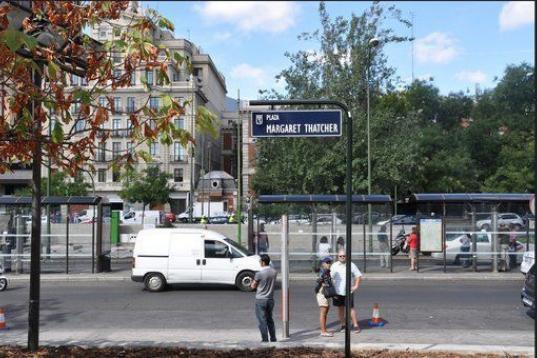 Paseo de la Castellana... esquina Margaret Thatcher. Desde este lunes, una céntrica plaza madrileña lleva el nombre de la ex primera ministra británica, el primer espacio público fuera del Reino Unido dedicado a esta figura.